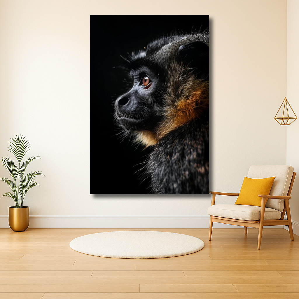 Dit betoverende schilderij vangt de stille charme van een aap die aandachtig naar de verte kijkt. De donkere achtergrond zorgt ervoor dat de zachte glans van zijn vacht en de bruisende tinten van zijn ogen nog meer opvallen. De subtiele oranje en witte tinten in de vacht geven een warme gloed die je direct aantrekt. Het is bijna alsof je zijn gedachten kunt raden terwijl hij in stilte mijmert. Perfect voor een plek in huis waar je wat extra karakter en mysterie wilt toevoegen. Laat je meevoeren en droom weg samen met deze nieuwsgierige aap.