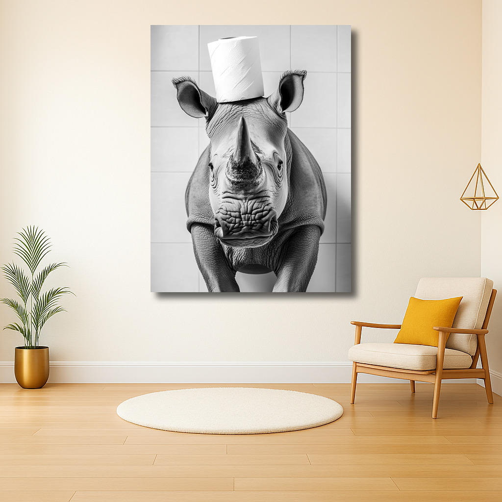 Deze unieke foto van een neushoorn met een rol toiletpapier op zijn hoofd laat je gegarandeerd glimlachen! Het is een hilarische twist op het idee van een ‘badkamerbezoek’, en de neutrale kleuren maken het extra leuk. Met zijn grote oren en die karakteristieke hoorn is deze neushoorn allesbehalve gewoontjes. Het lijkt alsof hij klaar is voor een stijlvol avontuur, of misschien gewoon voor een grapje. Deze afbeelding is perfect voor iedereen die van dieren houdt en wat humor in zijn leven kan gebruiken. Hang deze op je muur en laat je vrienden lachen! Iedereen houdt van een leuke en onverwachte twist in huis. Perfect voor een speelse sfeer!