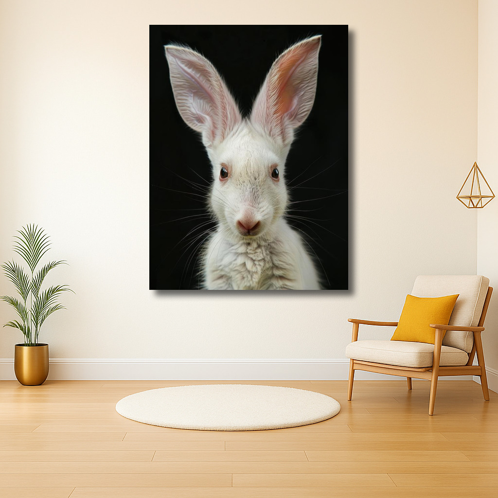 Dit schattige witte konijn kijkt je recht in de ogen aan met zijn grote, knappe oren en die lieve snuit. Het contrast met de zwarte achtergrond maakt het konijn nog meer de ster van de show. Of je nu een dierenliefhebber bent of gewoon op zoek bent naar iets schattigs voor aan de muur, deze foto gaat je hart zeker verwarmen. Het konijn lijkt wel te glimlachen en nodigt je uit om lekker bij hem te komen knuffelen. Perfect voor in de kinderkamer, de woonkamer of zelfs als een leuk cadeau voor vrienden en familie. Geef jouw muren een vleugje vrolijkheid met dit schattige konijn!
