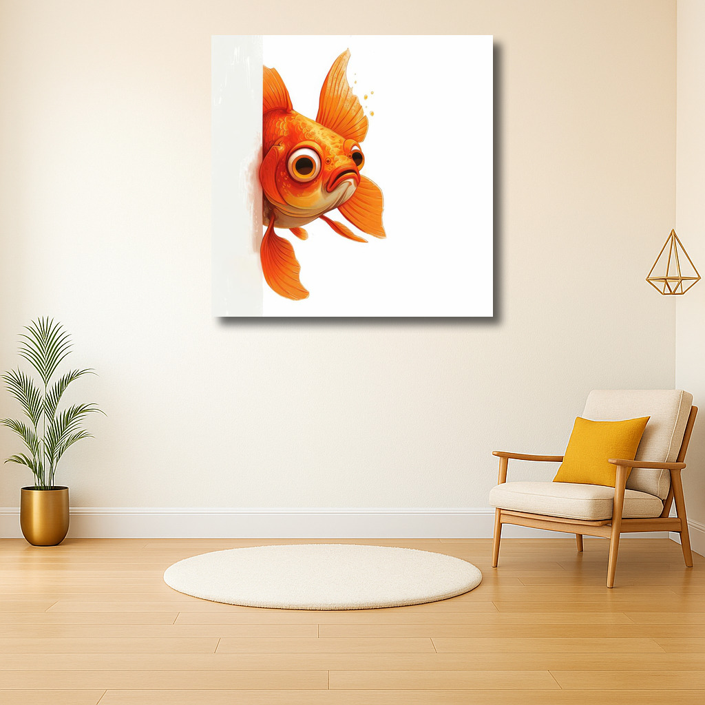 Deze schattige goudvis steekt zijn kopje naar buiten, en het lijkt wel alsof hij aan het lachen is! Met zijn grote, nieuwsgierige ogen en felle oranje kleur, brengt hij meteen een glimlach op je gezicht. Deze kunstwerk is perfect om je interieur een speelse en vrolijke uitstraling te geven. Hang het op in je woonkamer, slaapkamer of zelfs in de kinderkamer voor een dosis kleur en plezier. Deze goudvis is niet alleen een statement piece, maar ook een gespreksonderwerp dat iedereen zal opvallen. Dus, ben je op zoek naar iets unieks om je muren op te fleuren? Dit schilderij is echt een must-have!